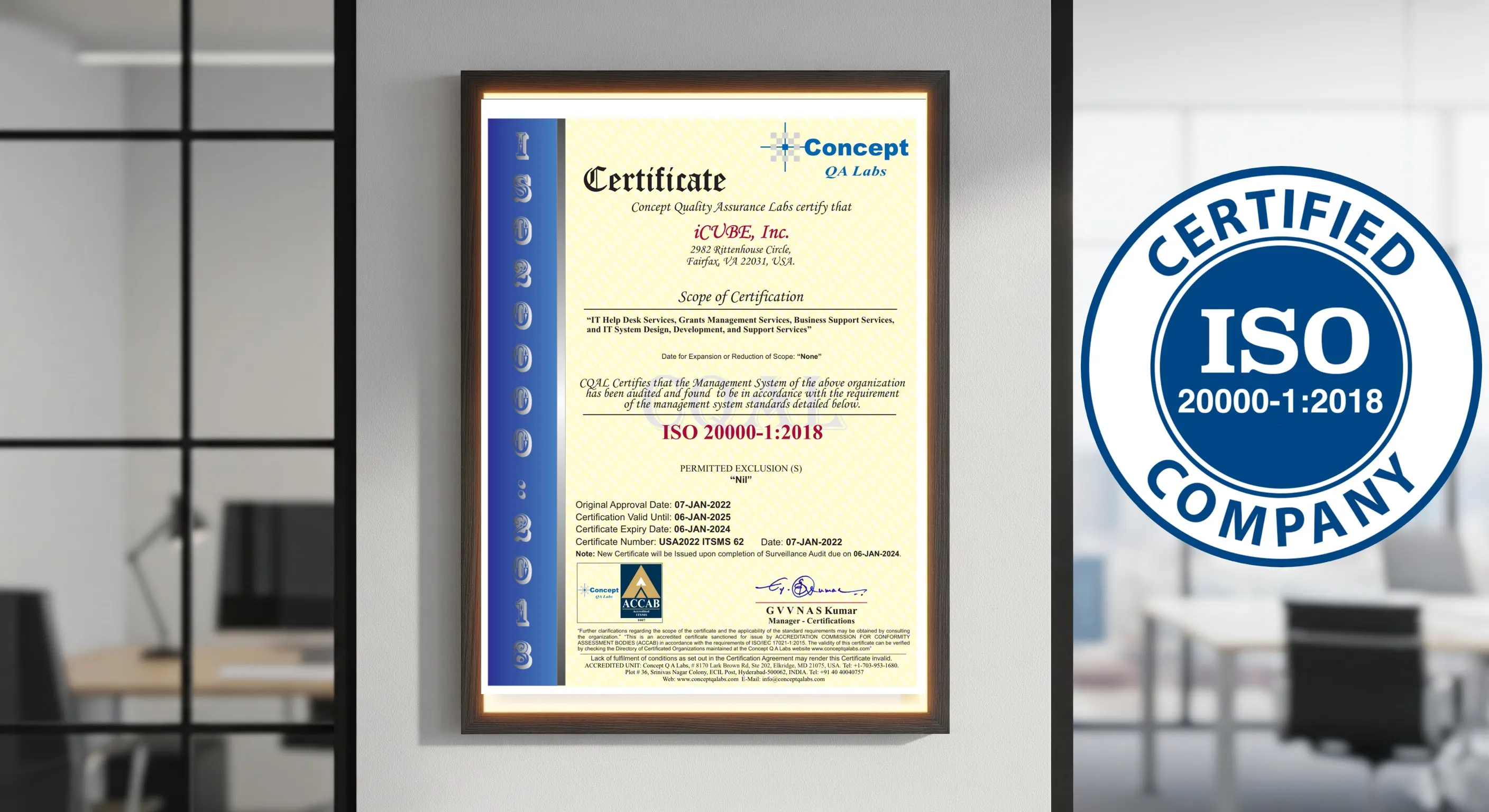 Fairfax-based iCUBE, Inc. (iCUBE) is proud to announce that is has achieved ISO/IEC 20000-1:2018 certification, a globally recognized standard for IT Service Management. This achievement is more than a certification—it is a testament to the dedication, expertise, and hard work of our entire team in delivering world-class IT services that our clients can rely on every day.ISO 20000-1:2018 provides a framework for excellence, ensuring that our IT services are efficient, reliable, and continuously improving. For our clients, this means faster response times, fewer service disruptions, and measurable improvements in the quality of IT support. It also demonstrates that iCUBE is committed to global best practices, risk management, and service accountability, giving our clients confidence that their business-critical operations are in safe hands.Achieving this certification reflects our ongoing focus on innovation and operational excellence, enabling us to deliver scalable, secure, and resilient IT services across all engagements. It positions iCUBE not only as a trusted partner but also as a benchmark for quality and service leadership in the IT industry. We look forward to continuing to exceed client expectations, strengthen long-term partnerships, and drive real business value through our certified IT service management practices.